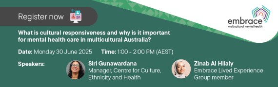 Register now to learn more about cultural competence as a core part of quality mental health care. For further information, please contact the Embrace team at Mental Health Australia at multicultural@mhaustralia.org.
